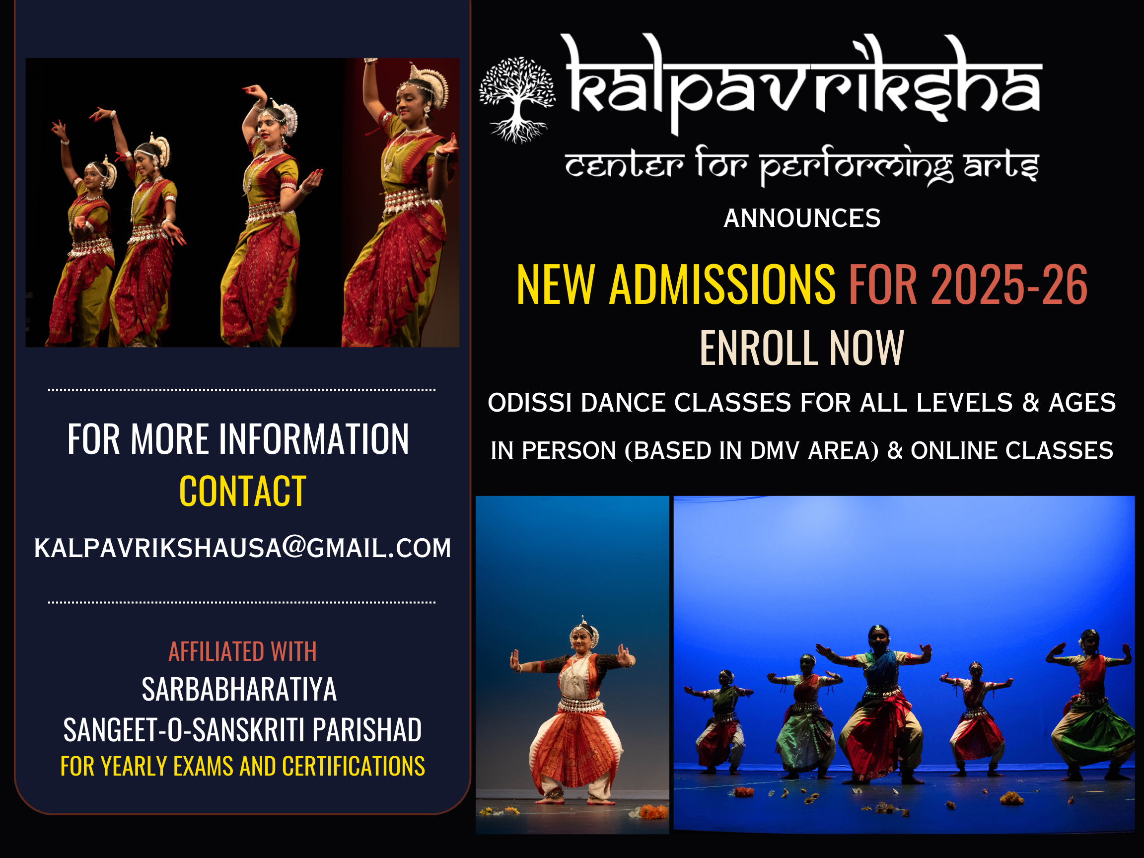 KalpaVriksha is a vibrant Odissi dance school based in Potomac, Maryland, welcoming students from across the DMV region—including Washington, D.C., Maryland, and Northern Virginia. Our community includes dancers from early childhood through adulthood, creating a diverse and supportive learning environment under Arpita’s guidance. Arpita is a dedicated disciple of Smt. Madhavi Mudgal and holds a Visharad Pratham diploma from Gandharva Mahavidyalay.